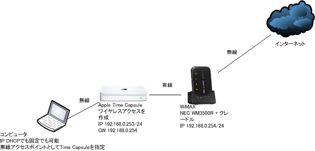 Apple Time Capsule(WiMAXとの接続は専用クレードルから有線LANとする。無線LANでもよいかもしれないが当方環境ではうまく稼動しなかった) IPアドレス 192.168.0.253 ※Time Capsuleは初期設定は一度は完了していること。
